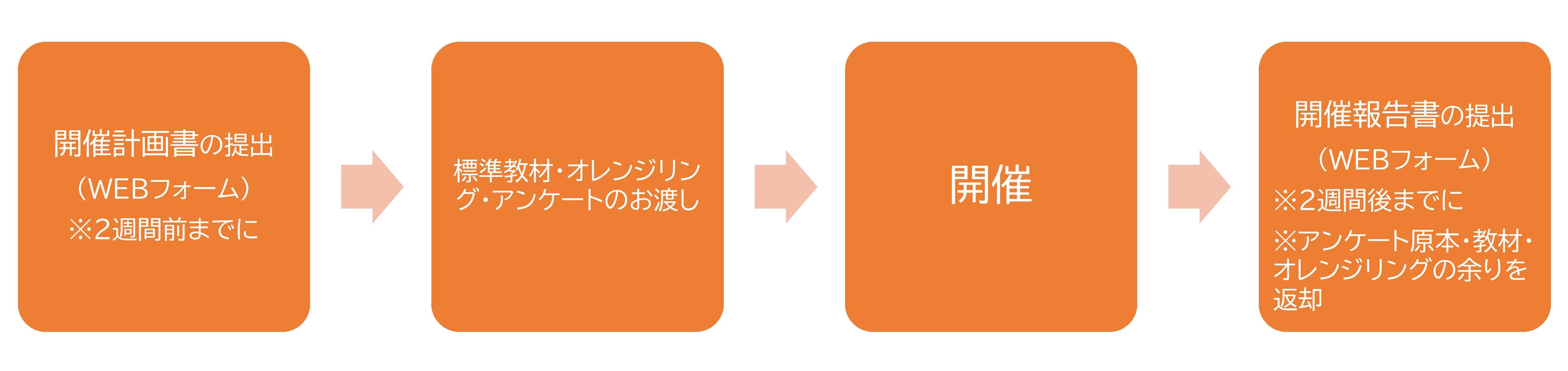 - 開催計画書は実施予定日の2週間前、開催報告書は開催日の2週間後までを目途にご提出ください。開催計画書受理後、標準教材・オレンジリング・アンケートをお渡しします。