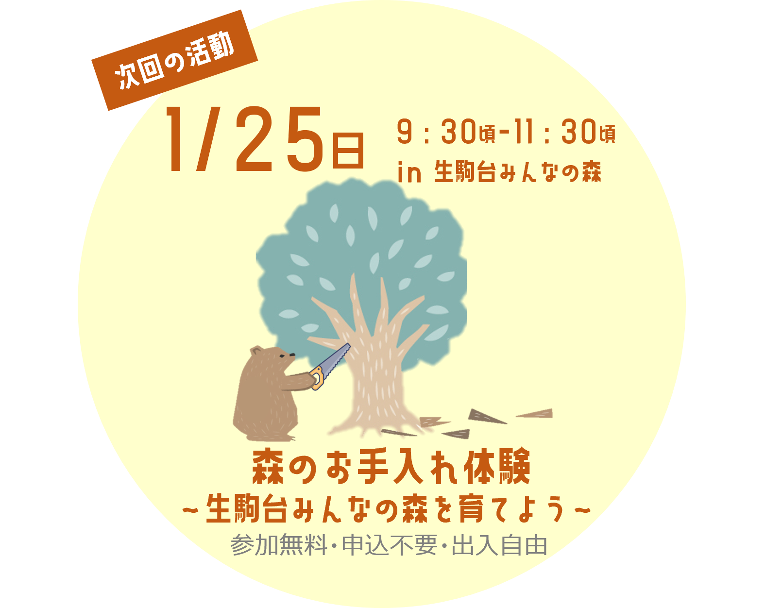 令和7年度から、生駒台みんなの森の活動日は奇数月のみの開催となります。活動日以外であっても、みなさまで草を刈るなどの森のお手入れや昆虫観察を実施されるのは自由です。