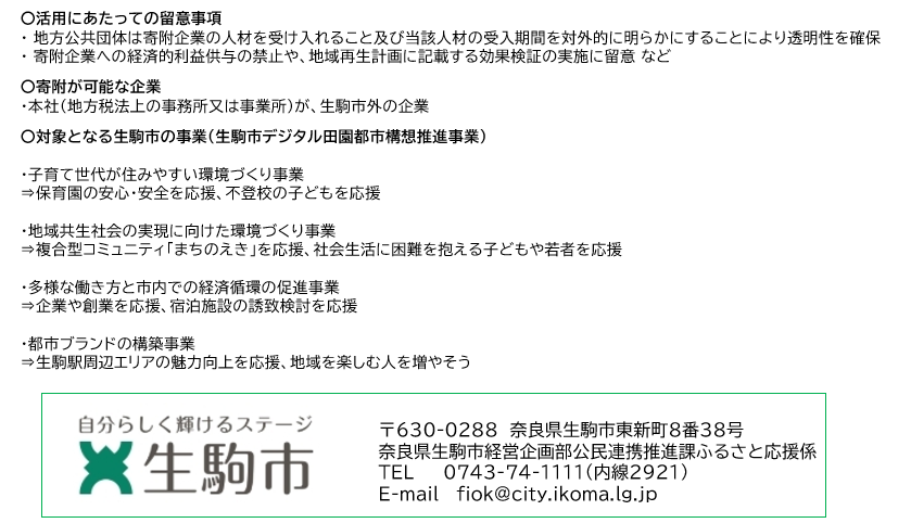 - 企業の本社が生駒市内に所在する場合、生駒市への企業版ふるさと納税は対象外となります。(本社とは、地方税法における「主たる事務所又は事業所」を指します。)