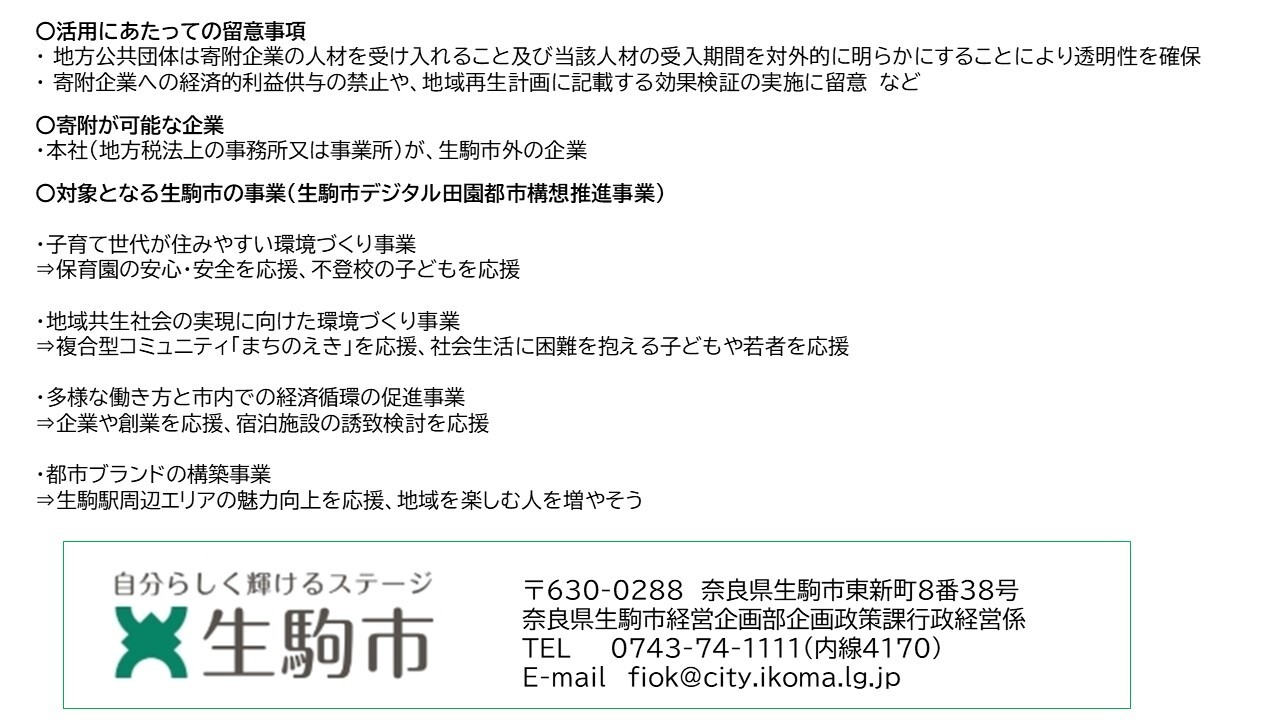 本市では、地方創生事業を推進するため、生駒市の取り組みを地方創生応援税制(企業版ふるさと納税)を活用した寄附により支援していただける企業を募っています。