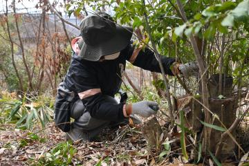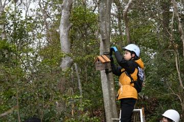 森の中を散策しながら、木の名前の由来や特徴を聞ました。参加者の名前を書き込んだ巣箱を設置したあとは、間伐作業にチャレンジしました。今回は、1本の大きな切株からたくさんの幹がでているものを、明るい森づくりのために間引きます。のこぎりの使い方もだんだん上手になりました。作業が進むと、森の中に光が差し込み、明るくなる感覚がわかります。