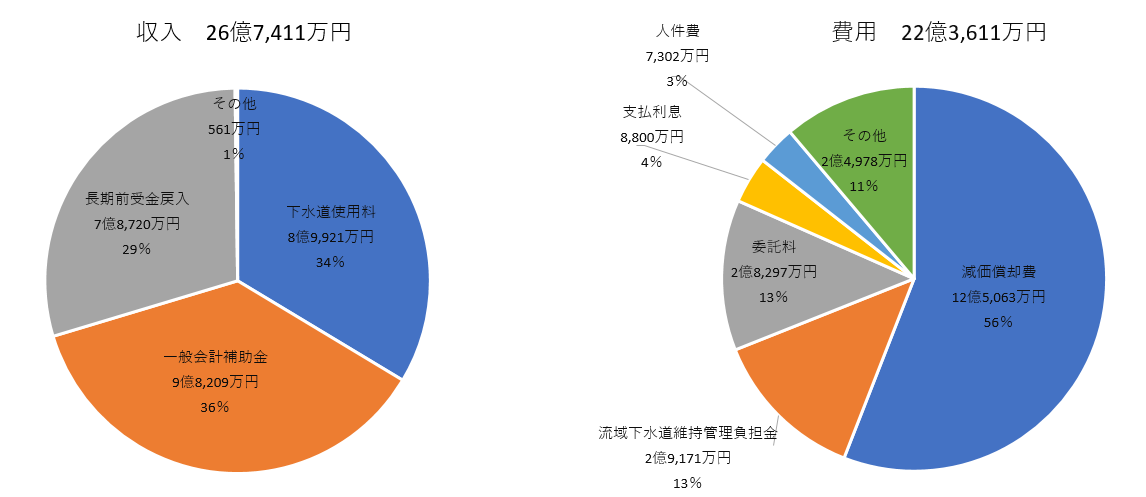 下水道使用料や一般会計補助金を収入しています。