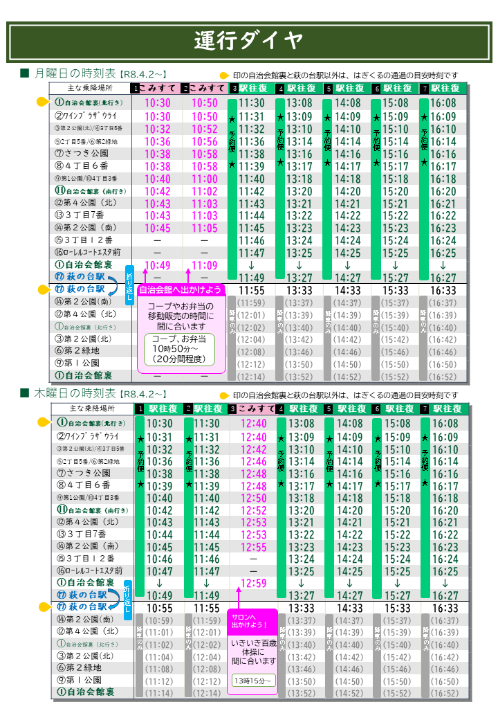 注意事項:萩の台駅行の便は予約が必要です。