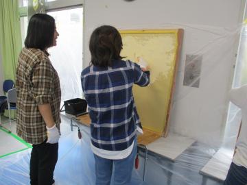 2人1組で1つのパネル両面にクロス貼りと壁塗り体験
