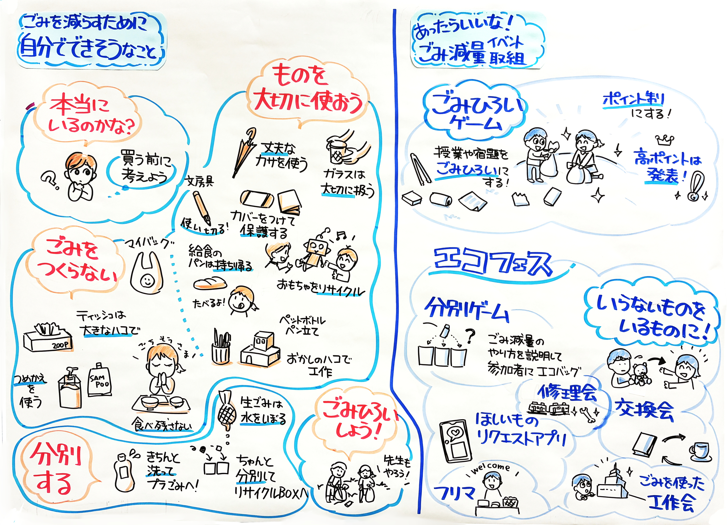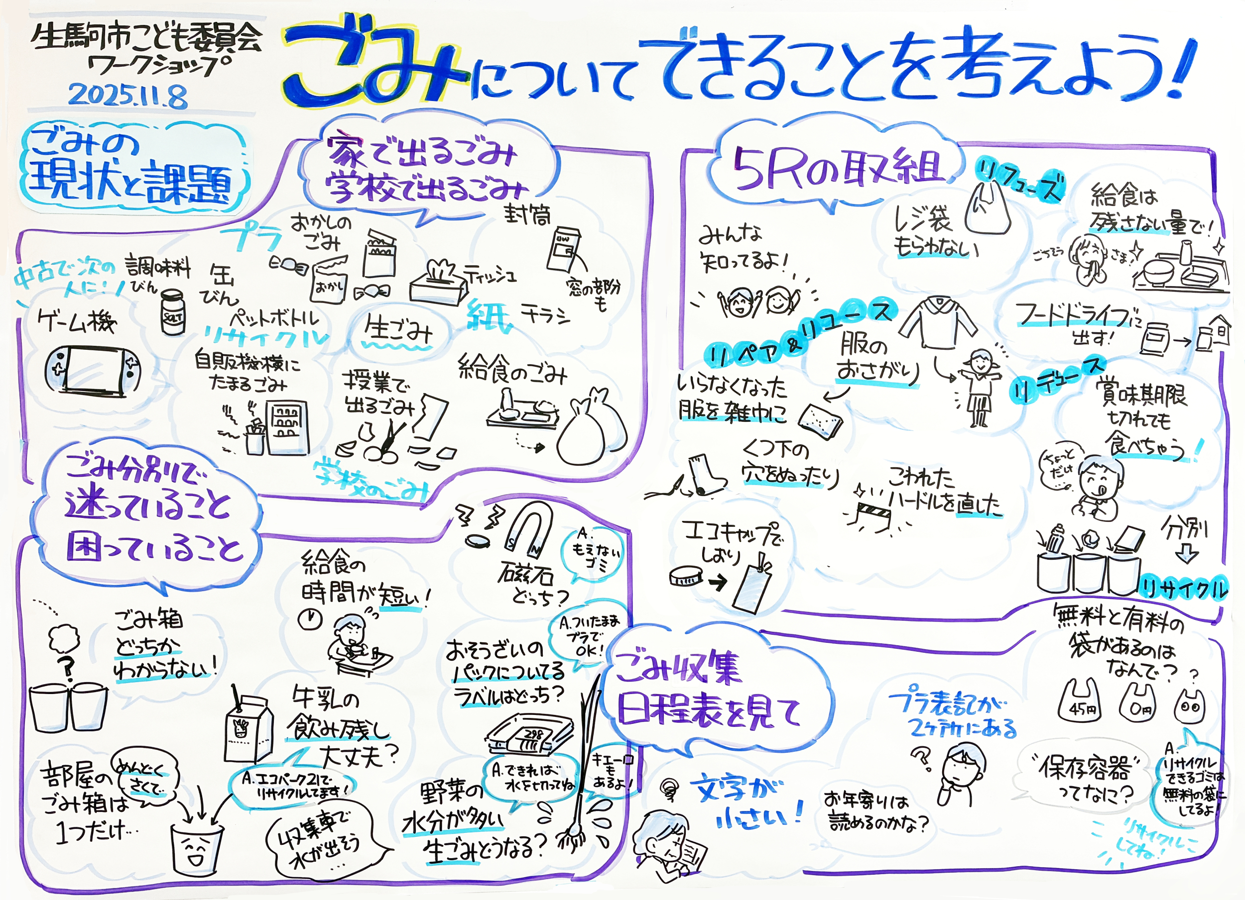 第2回目となるこども委員会では、「ごみをへらす」をテーマに、ごみについてこまっていることや、いつもやっている5Rの取組、ごみしゅう集日てい表を分かりやすくするためにはどうすればいいか、などについて意見をききました。
