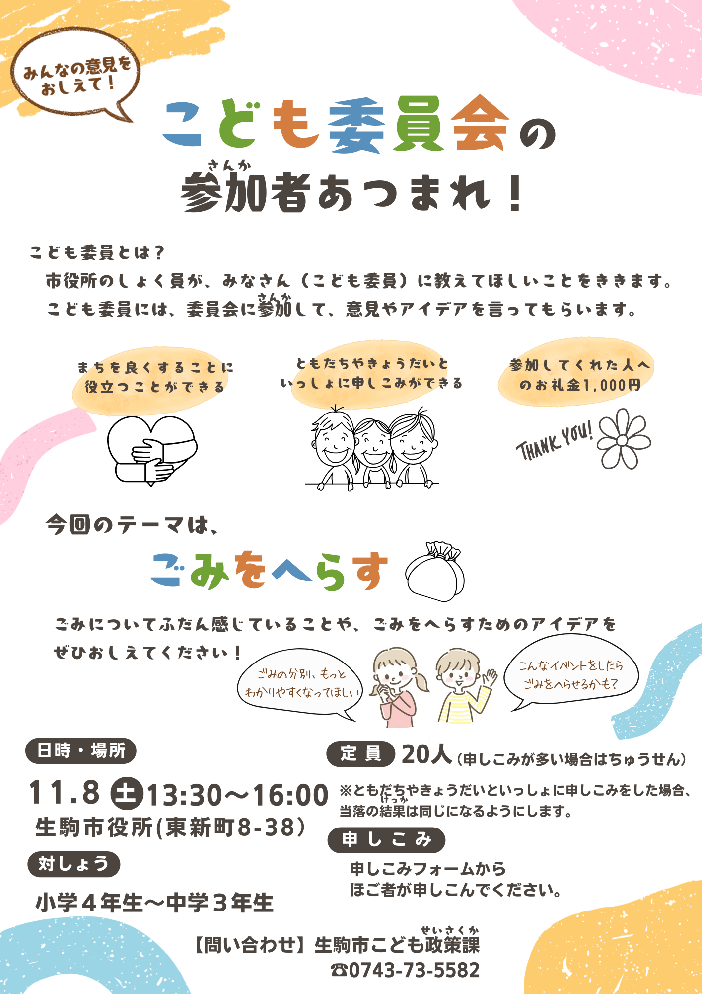 ・申し込みいただいた方は当落の結果に関わらずこども委員として登録させていただき、今後、別のテーマで 開催される委員会のご案内をお送りします(登録期間は令和8年3月31日まで、毎年度更新)。関心のあるテーマや都合のつく回のみ参加が可能です。