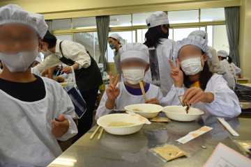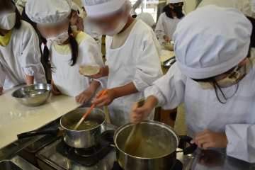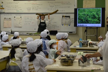 保護者が学級懇談会と「たけのこ」セミナーに参加しているとき、子どもたちは井上天極堂さんによる出前授業で奈良の伝統食材の吉野本葛について学びます。葛の根、葉や蔓、精製されたくず粉の実物を見たり触ったり、また、クイズに答えたりと、全員が夢中になりました。次は葛餅作りの実習です。生地を練る作業は加熱を伴うので、地域学校協働活動本部の方にも協力をお願いしました。くず粉に少量の砂糖と水を加えてへらでかき混ぜながら加熱すると、だんだん葛餅らしい透明のかたまりができ、子どもたちからは歓声が・・・。そして、お楽しみの試食タイムでは「おいしい!」「家でも作りたい!!」などの声があふれていました。