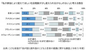 この事業は、令和5年に施行された「こども基本法」が掲げる理念(注意)に基づき、こどもの意見を学校運営や教育現場に反映させる仕組みづくりを進めるものです。日本では「自分の参加で社会を変えられる」と考える若者の割合(13~29歳)が諸外国に比べ低い現状があり(下図)、学校という最も身近な場で自己決定に関わることは、主体性や自己有用感を高める有効な手段とされています。