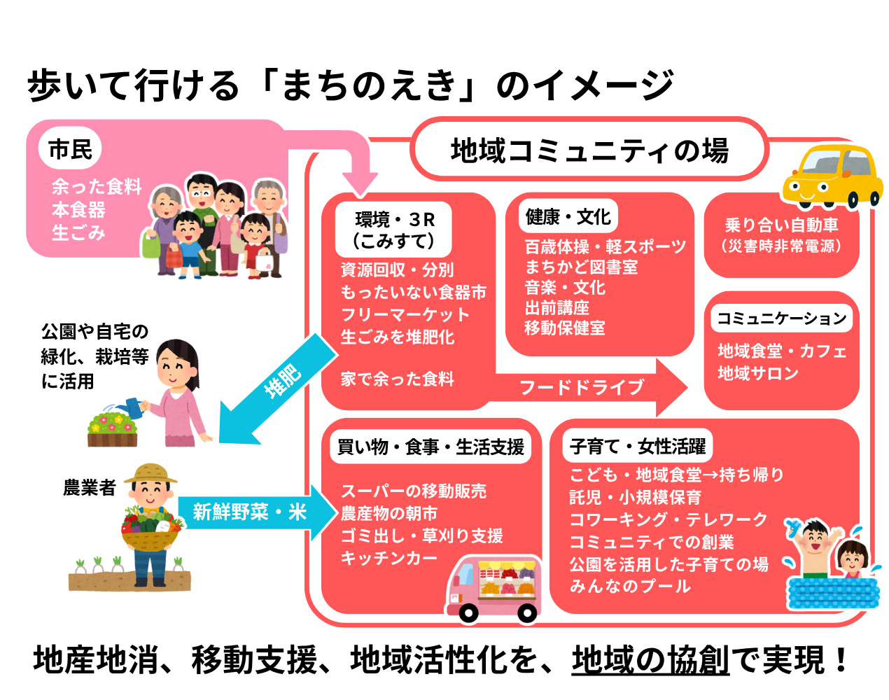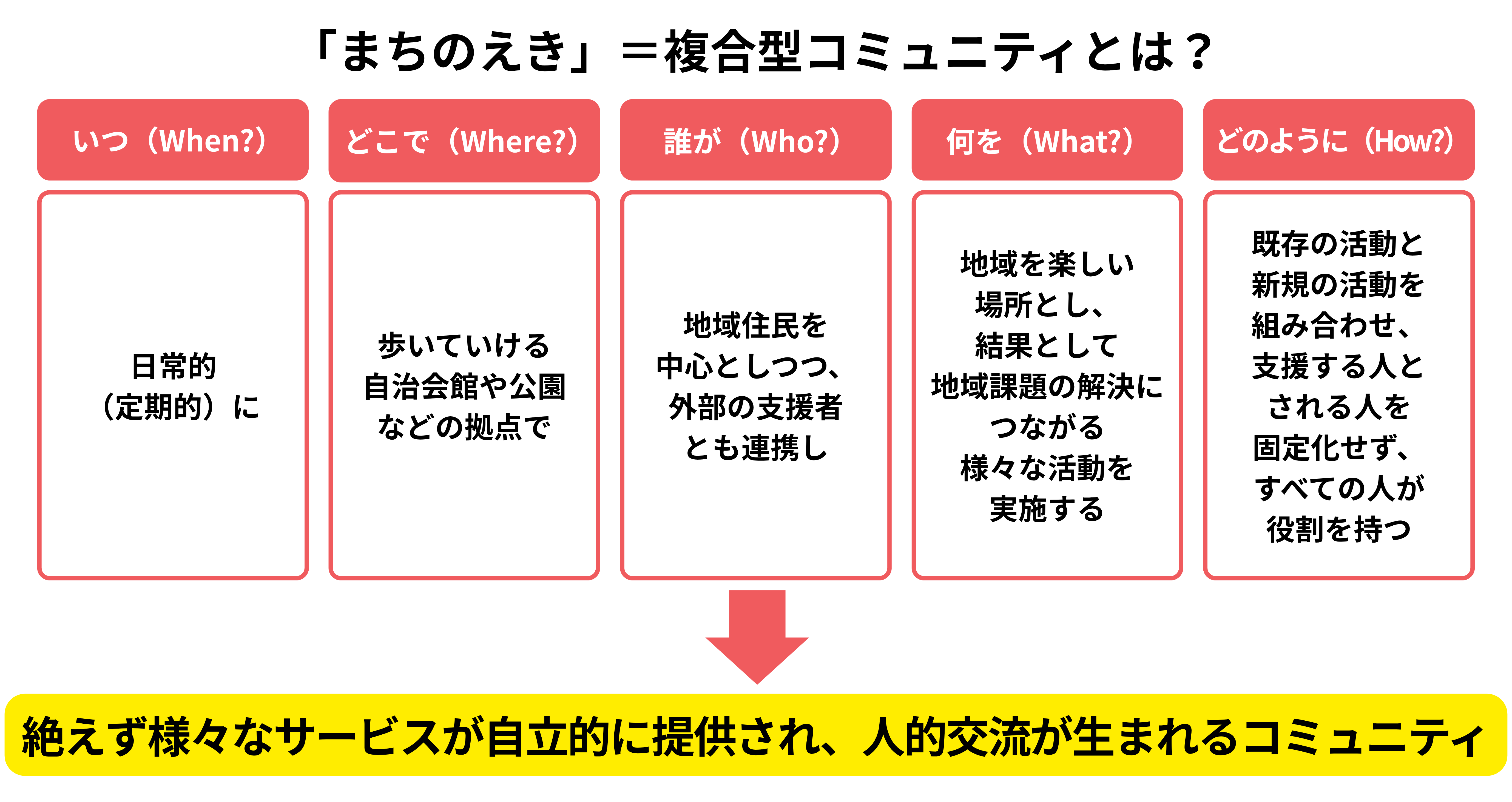 複合型コミュニティ(まちのえき)とは、地域の人が歩いて集える自治会の集会所や公園などの地域拠点を活用し、住民が主体となって様々な取組・サービスを複合的に展開する、地域の交流拠点です。