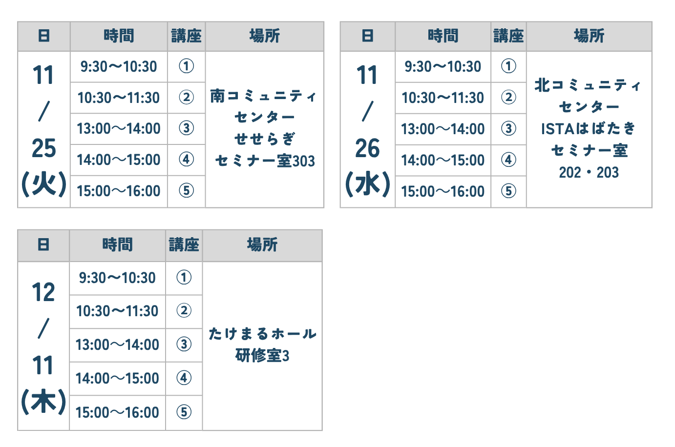 申込期間:11月1日(土曜日)~各講座の5日前まで(先着順、定員10名程度)