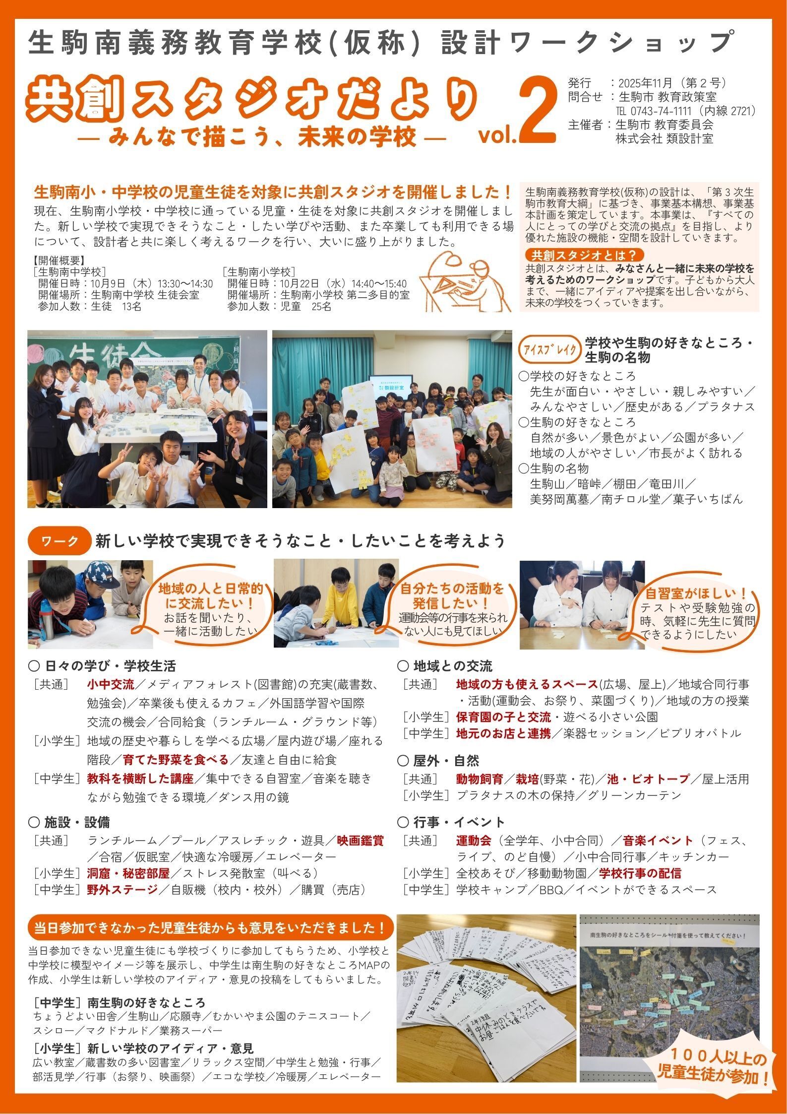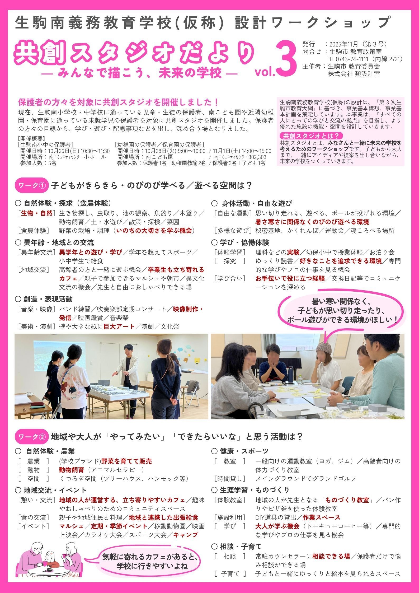 生駒市教育委員会では、生駒南義務教育学校(仮称)の新校舎の設計にあたり、教職員・子どもたち・保護者・地域のみなさんとともに「未来の学校」を考えるワークショップ「共創スタジオ」を開催しています。