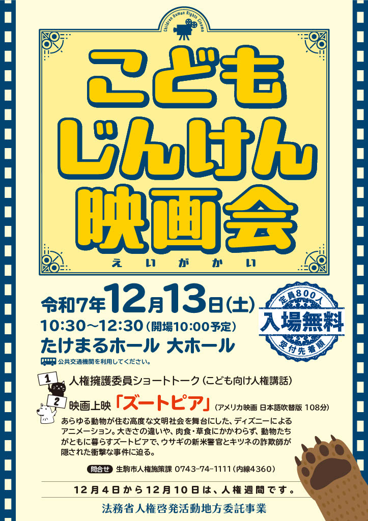 生駒市では、人権週間に合わせて「こどもじんけん映画会」を開催します。