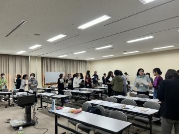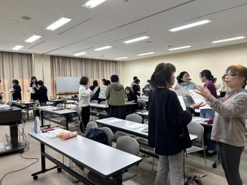 最初のプログラムは自己紹介デートゲームです。自由に歩き回りながら、目が合った人と最近嬉しかったことや、この講座を受講したきっかけを共有しました。受講生の皆さんは、初対面とは思えないほど大盛り上がりで、会話が弾んでいました。