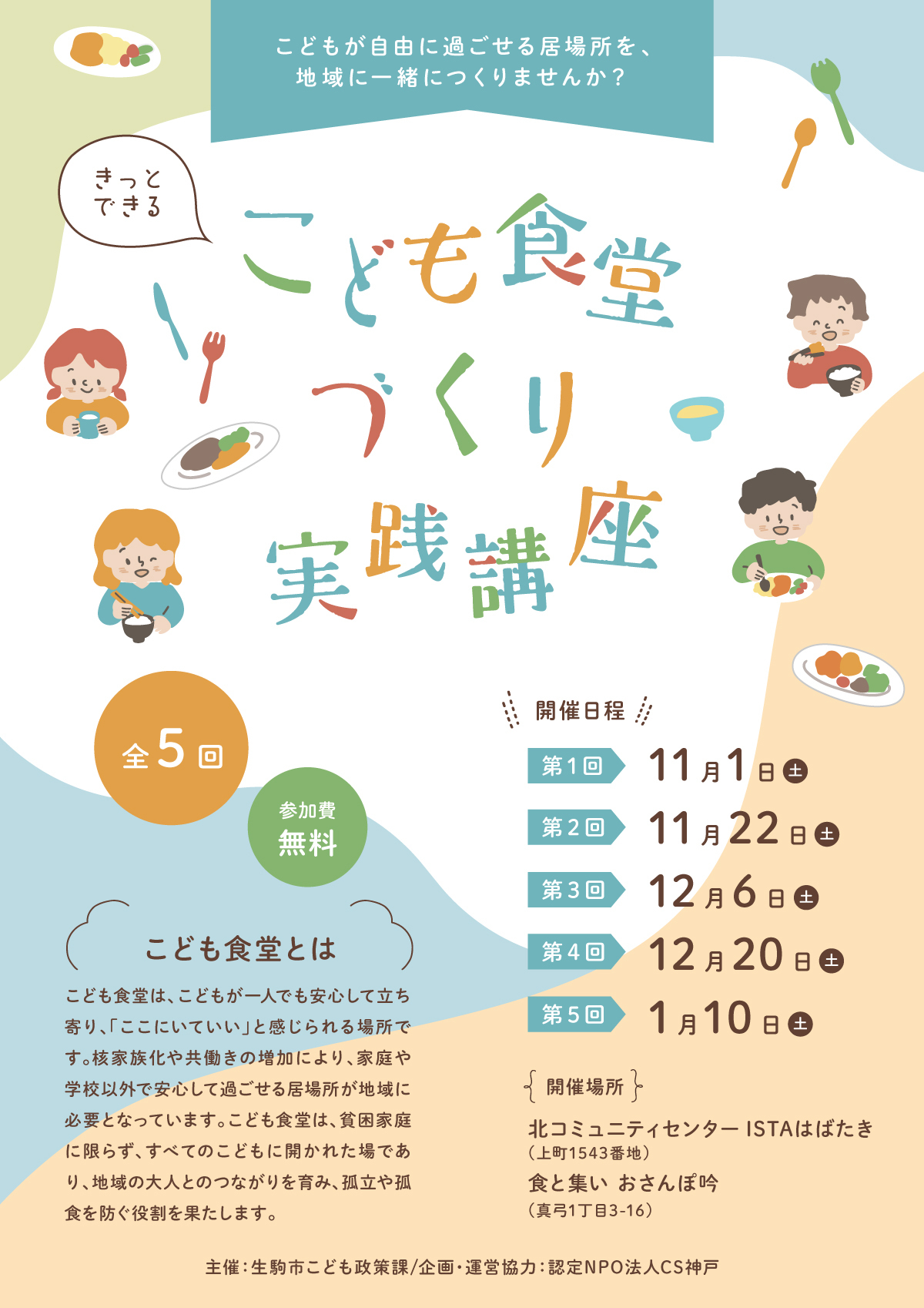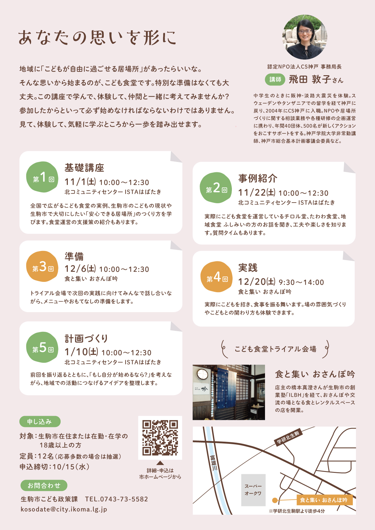 生駒市では、こどもが安心して過ごせる居場所を地域に広げるために、こども食堂に関心のある市民の皆さんが出会い、こども食堂準備から開設までを体系的に学ぶ連続講座を全5回で開催します。こちらのページでは、講座当日の様子を順次公開します。