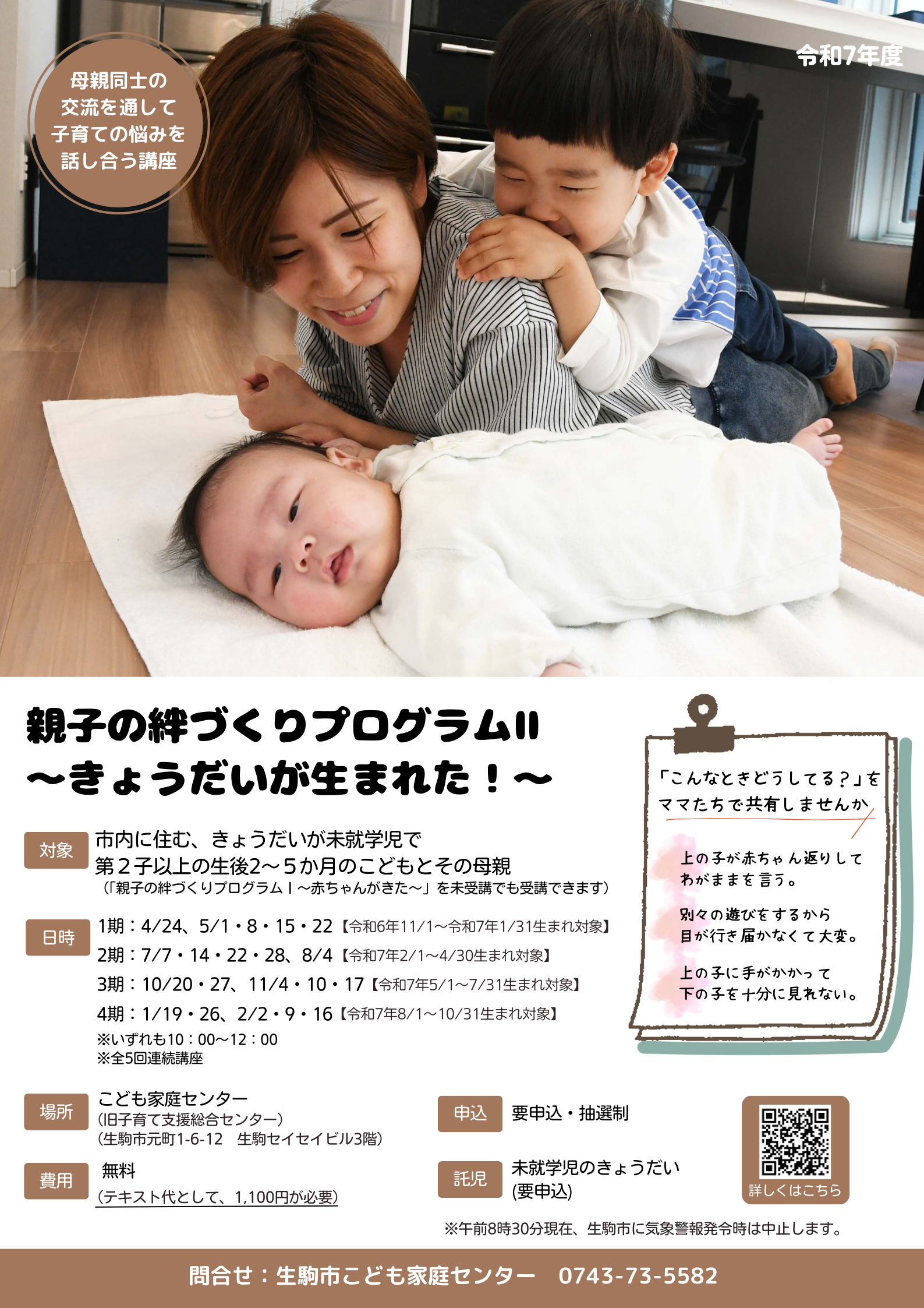 こどもの名前・ふりがな・生年月日も必要))】を書いて、こども家庭センター「親子の絆づくりプログラム2きょうだいが生まれた!」係に申込みください。