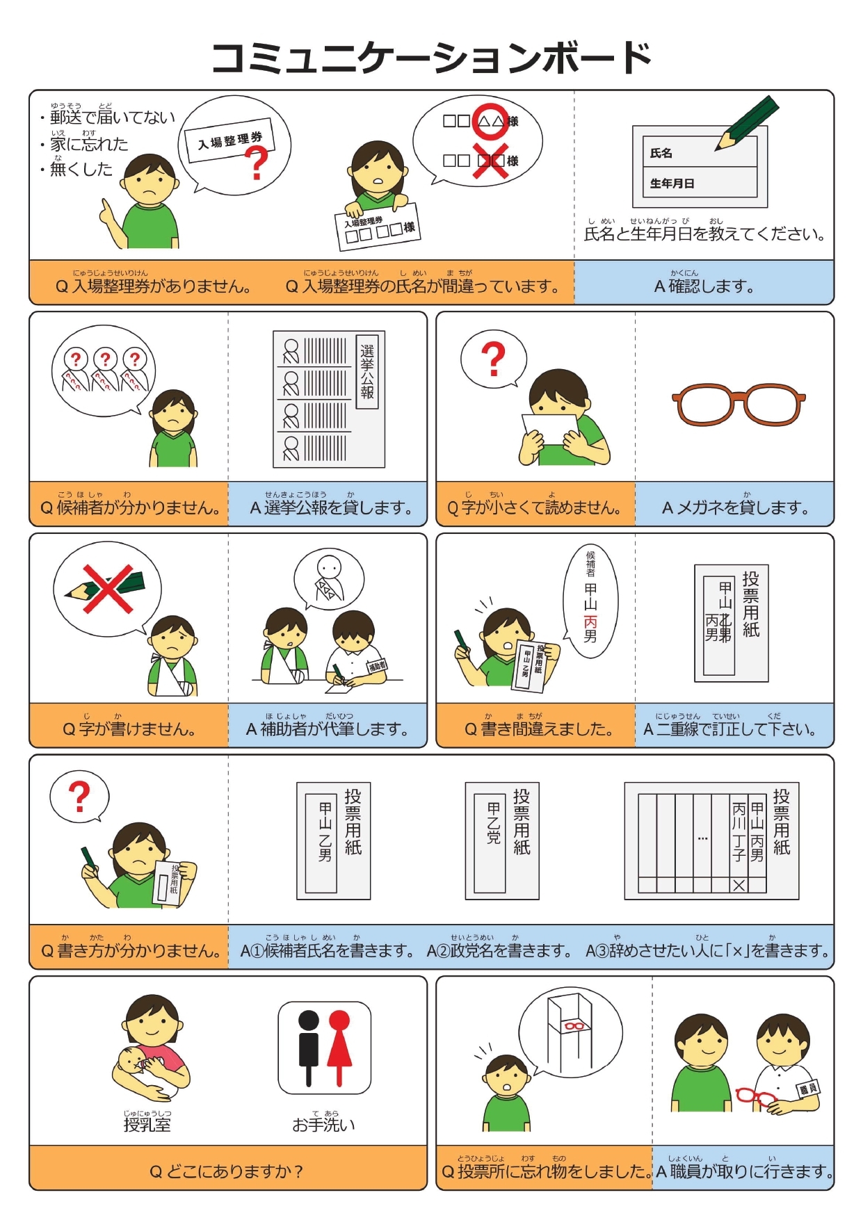 投票所における選挙人との円滑なコミュニケーションのため、良くある問い合わせ等についてイラストや文字で記載したものがコミュニケーションボードです。