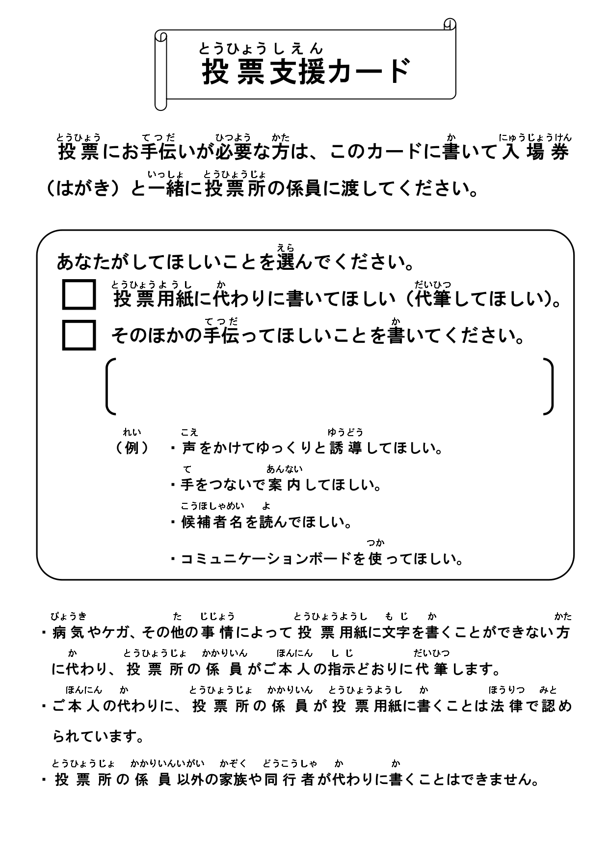 印刷して、投票所で支援してほしいことをあらかじめ記入することにより、投票所でのすばやい対応や