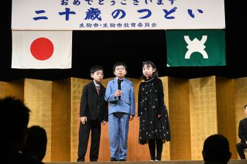 記念行事の最後を締めくくるエンディングセレモニーでは、二十歳のつどい運営委員会の脇本 千翔さん、長谷川 一球さん、谷口 寛文さんの3名が、運営委員を代表してあいさつをしました。