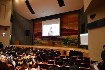 開式前に、会場内で二十歳のつどい運営委員が取材・制作した中学校時代の恩師からのビデオレターを上映しました。懐かしい先生からのメッセージに歓声が上がるなど、会場内は盛り上がりを見せていました。