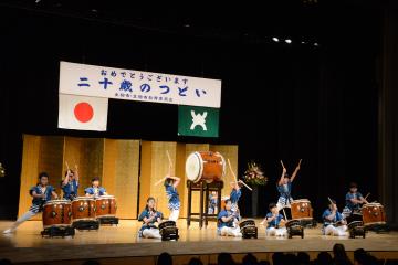 記念行事の最初は、「生駒山麓太鼓保存会」による演奏でした。力強く響く太鼓の音に、参加者も終始聴き入っていました。最後は二十歳を迎える方々へのお祝いの言葉で、演奏が締めくくられました。