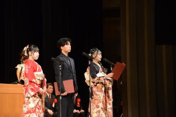 二十歳のつどい運営委員会の西山 心音さん、丸瀬 龍之介さん、脇本 千翔さんが、二十歳の節目を迎え、新たなる一歩を踏み出す決意として、「誓いの言葉」を表明しました。