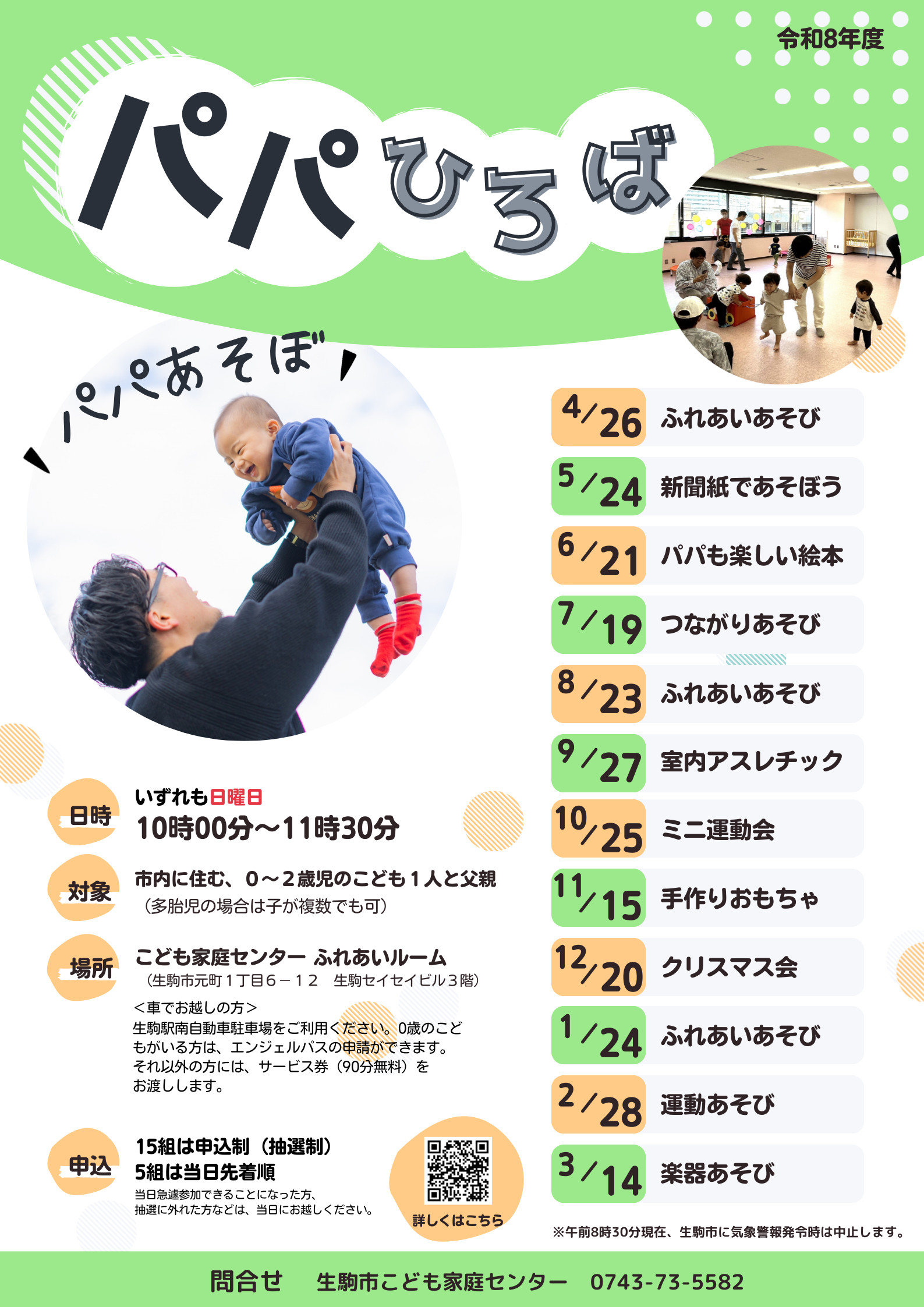 ◆「パパひろば」は、15組は申込制・抽選制、5組は当日先着順です。