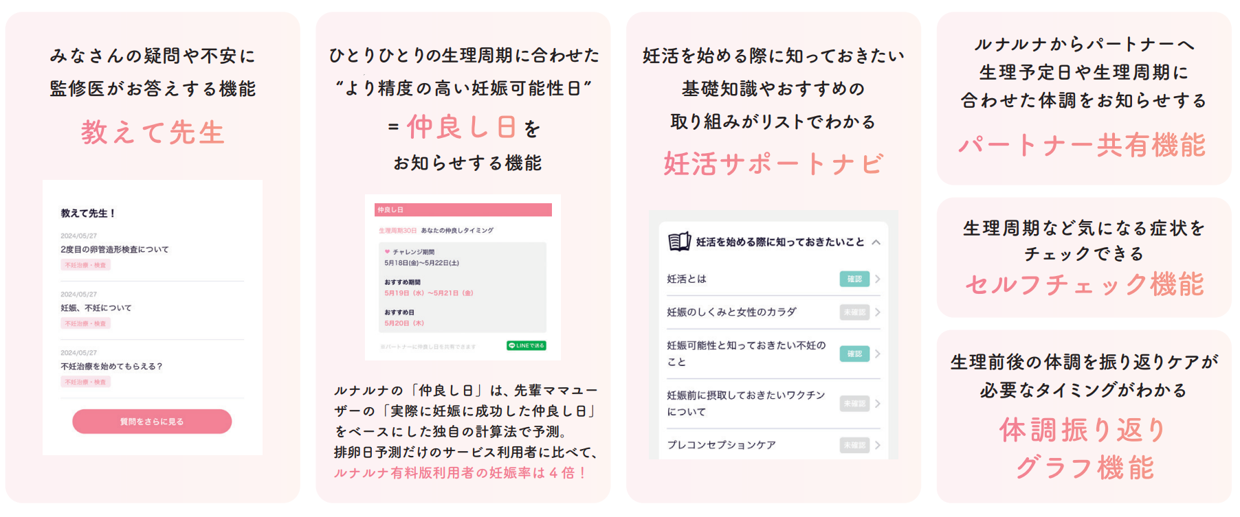この連携協定により、令和10年3月31日までの2年間、通常有料となる女性の健康管理アプリ「ルナルナ」の「プレミアムコース」を無料で利用いただくことができます。