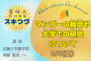 「スキつづ。」シリーズの第3回目は、百貨店で販売されている人気の高級果物「近大マンゴー」の話を通じて、農業や植物について楽しく学ぶ講座を開催します。「近大マンゴー」の研究の第一人者である神崎先生の話を聞いて、農業や植物のこと、身近なものでもたくさんの研究の上に成り立っていることを学びましょう。また、普段大学でどういうふうに研究されているかだけだなく、研究職になったきっかけや、研究のおもしろさを教えてもらえます。もしかしたらマンゴーの味見もできるかも!?