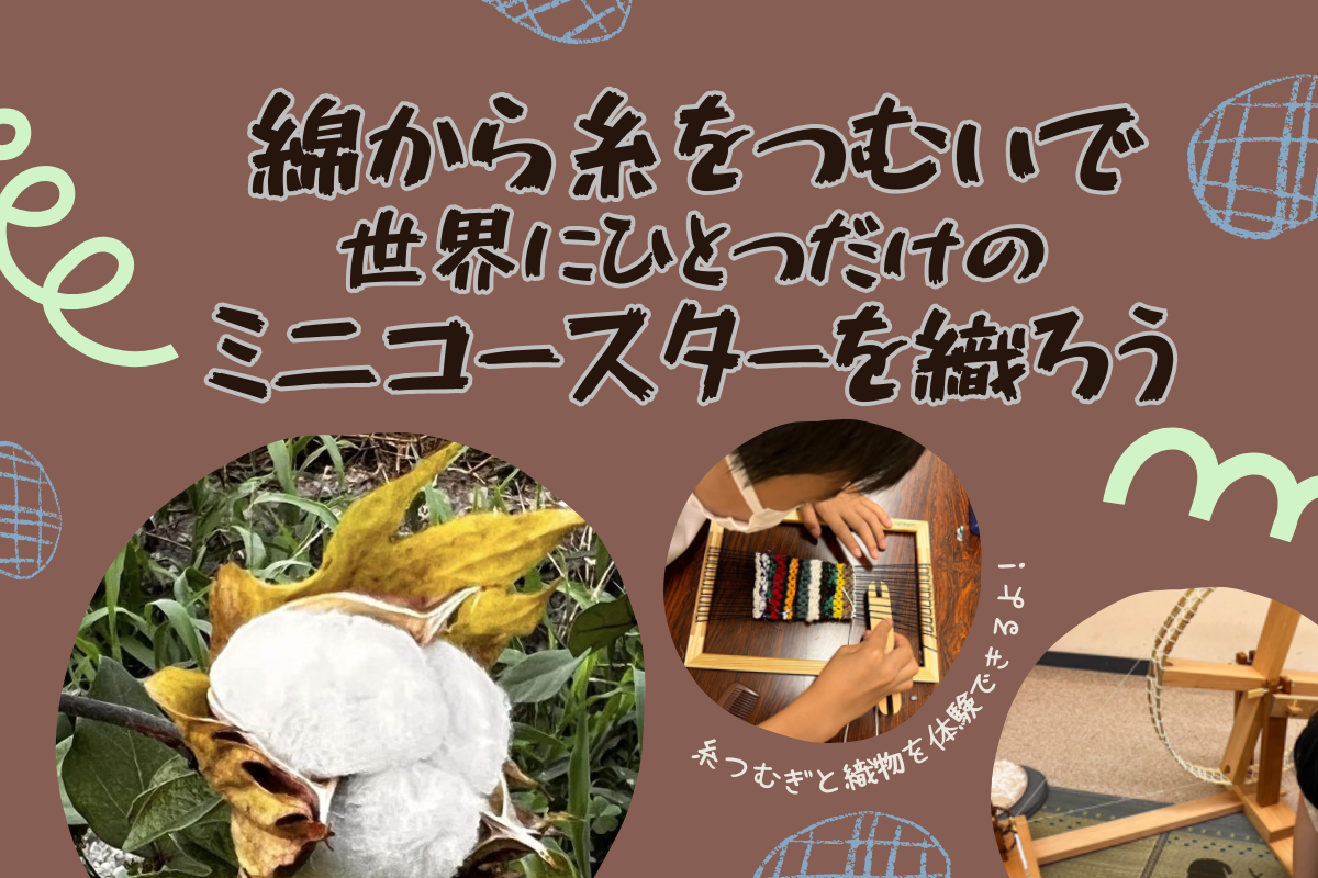 綿から糸を紡いでミニコースターを織る体験を通じて、綿のしくみや、ものづくりを学びましょう。